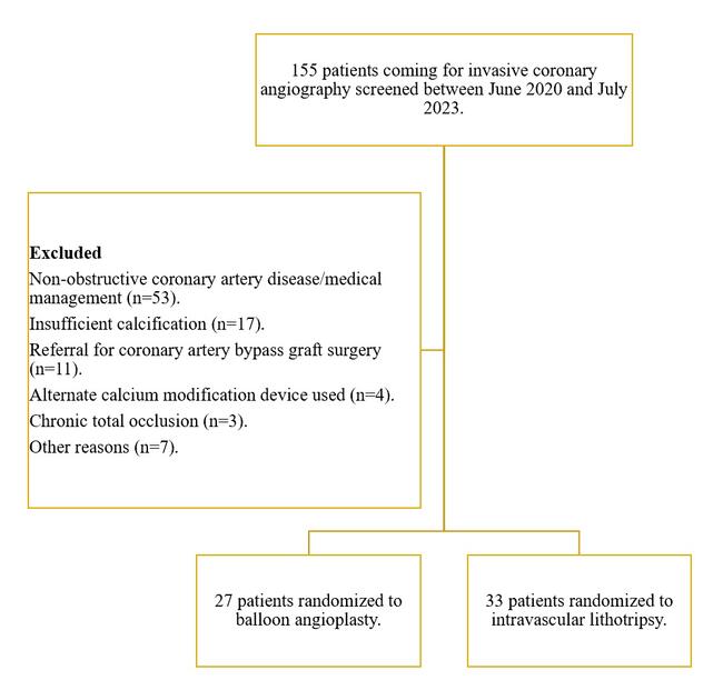 Intravascular lithotripsy (IVL) is a balloon-based technology that utilizes circumferential acoustic pressure waves to fracture calcium layers without affecting soft tissue because of its lesser density and greater elasticity.6 IVL has shown excellent safety and efficacy for treating severe coronary calcification in a series of single-arm studies, but randomized data have been limited.7-10 In this prospective, randomized controlled study, we aimed to investigate if procedural success in PCI of severely calcified lesions is superior when pre-treated with IVL compared with conventional balloon dilatation.