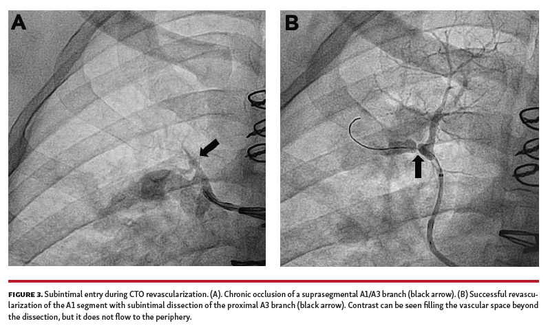 One clear challenge for CTO intervention is interpretation of distal lesion pathology. For example, early interventions occasionally resulted in an angiographic pattern of contrast distal to the lesion within a vascular space, but without distal flow into the capillary bed or pulmonary veins. We initially interpreted this as heavy thrombotic disease beyond the proximal occlusion; however, attempts at distal balloon angioplasty never resulted in restoration of forward flow into the periphery or pulmonary venous return when this initial pattern was seen. It was only after repeated interventions that we recognized this as the angiographic pattern of subintimal dissection within the PAs (Figure 3). As our understanding of subintimal vessel anatomy evolved and our success rate improved, we found that re-entry into the PA lumen just beyond the occlusive cap with either STAR or Stingray balloon technique resulted in significant vessel recruitment. In hindsight, the vast majority of our failed interventions were due to misinterpretation of subintimal dissection as heavy thrombotic burden, offering the possibility for higher success rates during the initial intervention as we improve our ability to work within this space.