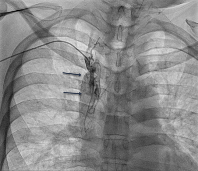 Our very high success rate of arm venous access1 is secondary to real-time ultrasound-guided access,12 and we strongly recommend this technique. We preferentially access the deeper brachial and basilic veins, as these are usually ‘straighter shots’ up the medial aspect of the arm to the subclavian vein. However, we occasionally access the more superficial antecubital vein(s), and sometimes the deeper median or more lateral cephalic vein. In our catheterization lab, unsuccessful RHC from the arm is rarely due to the inability to obtain venous access in the arm. Instead, it is a result of failure to advance a wire and/or catheter through the SVS. In our study, the most common reason for SVS was the presence of wires for pacemaker/ICD devices, which occurred in 12 cases (66.7%). Three patients (16.7%) had either a port-a-cath, tunneled catheter for hemodialysis in place, or a history of prolonged peripherally inserted central catheter (PICC) line. Three patients (16.7%) had no pre-existing wires/catheters on the ipsilateral side, of which 2 patients had prior cardiac surgeries.