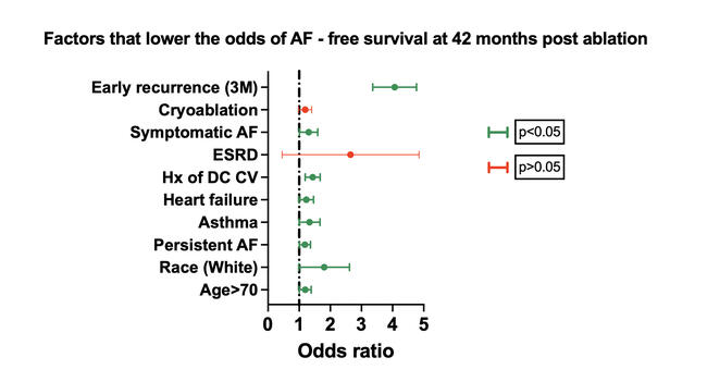 Although not significant, and likely because of the low overall incidence rate in the cohort (1%), ESRD demonstrated a trend toward being associated with long-term AF recurrence. It is interesting to note that BMI was not associated with long-term AF recurrence within our cohort, a finding that is commonly reported in the existing literature.29,30 Like HF and AF, the relationship between obesity and AF is both bidirectional and multifactorial. That our cohort did not demonstrate this relationship speaks to the ever-evolving information surrounding the exact pathophysiological mechanisms occurring within AF. More studies are needed to elucidate this connection, especially considering the growing epidemiological disease burden imparted by both AF and obesity.