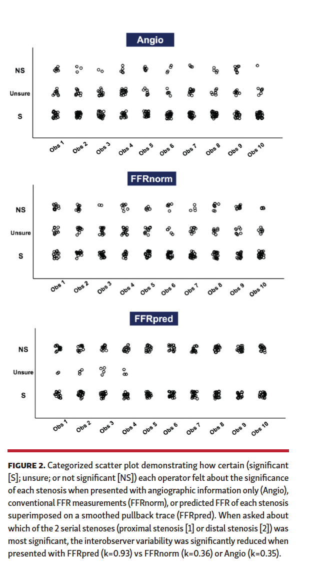 Assessment of individual lesion significance. When asked about whether a lesion was significant, 26% were unsure using the Angio value alone. Supplementing operators with FFRnorm did not significantly affect their uncertainty (28%). However, when presented with FFRpred, operator uncertainty about the significance of a lesion fell to 3% of all lesions (P<.001) (Figure 2). This was accompanied by a significant reduction in interobserver variability (Table 1).