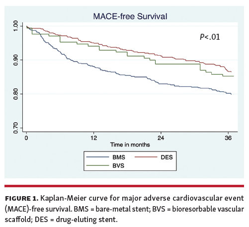 Statistical analysis. Based on prior large randomized trials comparing BMS and DES,1,2 we estimated that MACE occurs in 20% of the patients. Power calculation showed that the study population size had a power of 0.84 to detect a 33% difference in odds of MACE. Continuous variables are expressed as mean ± standard deviation or median with interquartile range (IQR) as appropriate, and discrete variables as frequencies with percentages. Comparison of the baseline clinical characteristics was performed using Student’s t-test or one-way analysis of variance. Kaplan-Meier survival analyses with the log-rank test were carried out and Cox proportional hazards regression model was used to calculate hazard ratios (HRs) for the incidence of MACE adjusting for confounders. Multivariable logistic regression was performed to evaluate the relationship between choice of stent/scaffold (BVS, DES, and BVS) and MACE, after adjustment for statistically significant variables in univariate analysis.