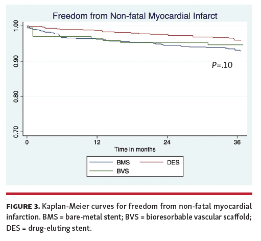 In patients with BVS implantation, the risk of composite outcome of MACE (death, NFMI, TVR) at 3 years was not significantly different compared with patients with BMS or first-generation DES implantation.
