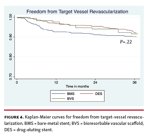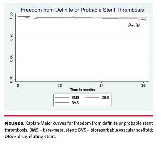 In the exploratory analysis, BVS was not associated with increased risk of definite or probable stent thrombosis compared with BMS (adjusted OR, 1.17; 95% CI, 0.22-6.04; P=.85) or DES (adjusted OR, 1.11; 95% CI, 0.22-5.51; P=.90).
