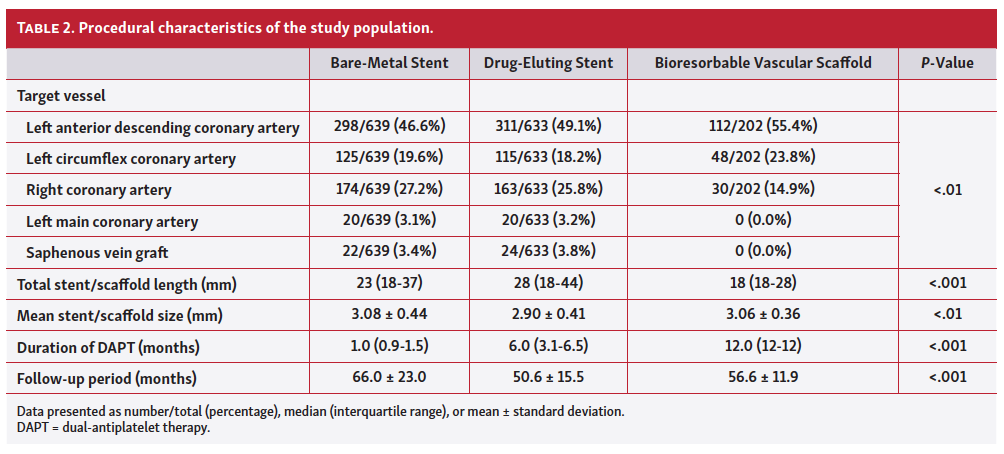 A total of 1396 patients were analyzed, including 622 patients who received BMS implantation and 604 patients who received DES implantation between 2001 and 2005, and 170 patients who received BVS implantation between 2014 and 2017. In the entire study cohort, 1048 patients (75.1%) were men and the mean age was 63.7 ± 10.8 years. Patients who received BVS were younger, as well as less likely to have diabetes, hypertension, prior myocardial infarct or PCI, and acute coronary syndrome. Table 1 shows the baseline characteristics of the study population and Table 2 shows the procedural characteristics of index PCI.