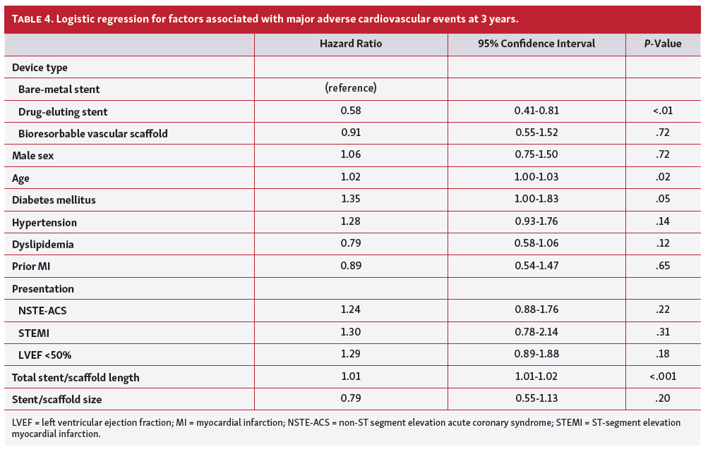 Exploratory analysis. Since stent thrombosis was a key safety concern for BVS,17,18 we compared the composite endpoint of definite or probable stent thrombosis across choice of stent/scaffold after confounder adjustment with the same logistic regression model. Data management and statistical analyses were performed in Stata software (StataCorp/MP, version 16). A two-tailed P-value of <.05 was considered statistically significant.