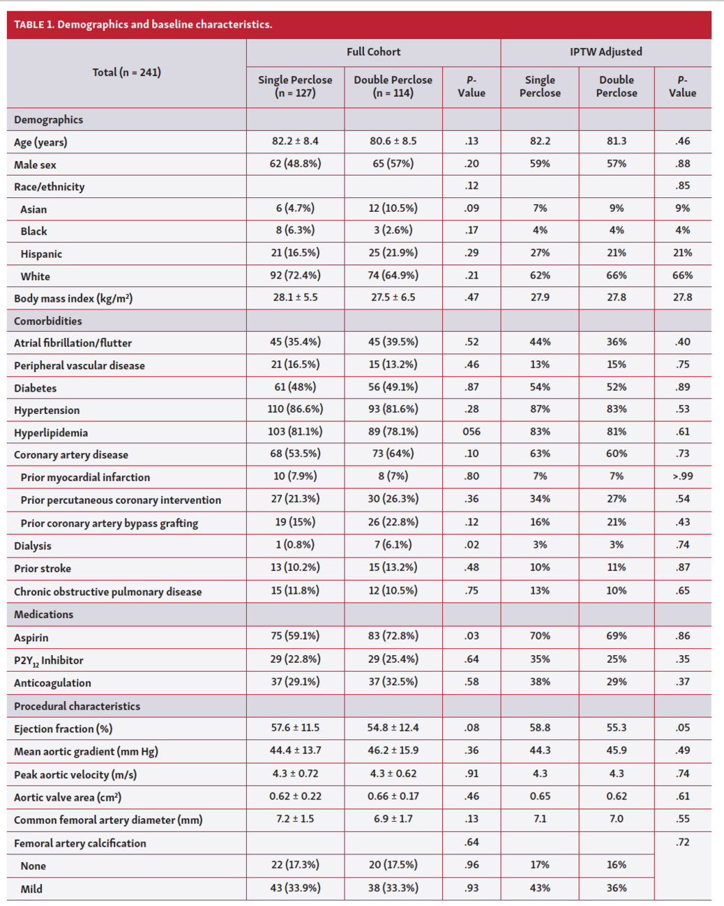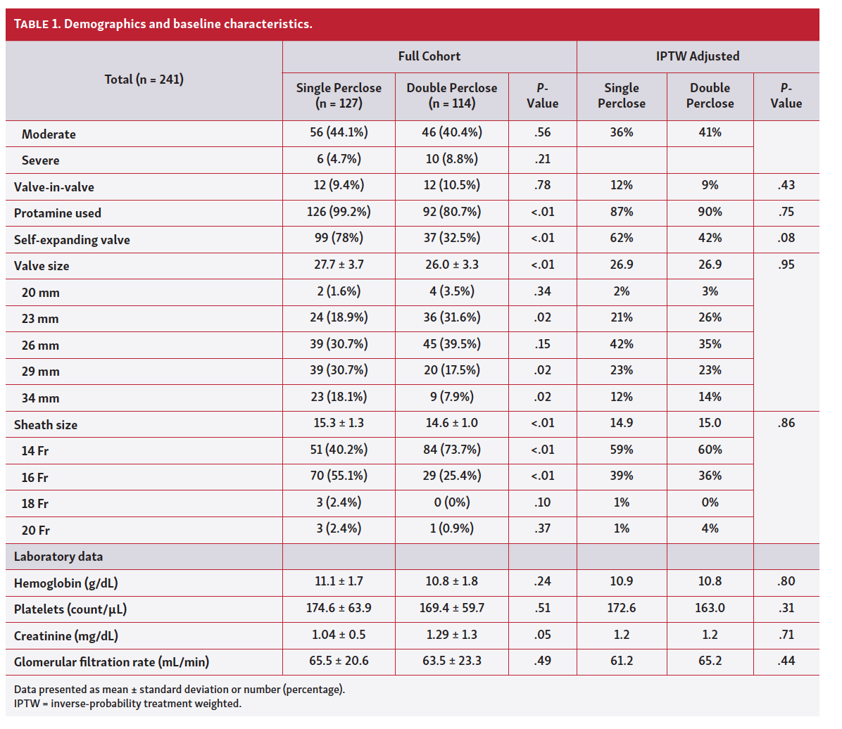 Demographic and clinical characteristics. A total of 241 patients (mean age, 81.4 ± 8.5 years; 47% women) were included in the study (Table 1A and 1B). Of these, 127 (52.7%) underwent an upfront SP approach and 114 (47.3%) underwent an upfront DP approach. Compared with a DP approach, those treated with SP were less likely to be on dialysis (0.8% in the SP group vs 6.1% in the DP group; P=.02) and to be taking aspirin (59.1% in the SP group vs 72.8% in the DP group; P=.03), but more likely to have been administered protamine (99.2% in the SP group vs 80.7% in the DP group; P<0.01), to have a self-expanding valve used (78% in the SP group vs 32.5% in the DP group; P<.01), to receive a larger valve size (mean size, 27.7 ± 3.7 mm in the SP group vs 26 ± 3.3 mm in the DP group [P<.01]; 34 mm valve, 18.1% in the SP group vs 7.9% in the DP group; 29 mm valve, 30.7% in the SP group vs 17.5% in the DP group), and larger delivery sheath size (mean sheath size, 15.3 ± 1.3 Fr in the SP group vs 14.6 ± 1.0 Fr in the DP group [P<.01]; 16 Fr sheath, 55.1% in the SP group vs 25.4% in the DP group; 14 Fr sheath, 40.2% in the SP group vs 73.7% in the DP group). There were no significant differences in access-site femoral artery calcification, femoral artery diameter, P2Y12 inhibitor or anticoagulation use prior to TAVR, or history of peripheral vascular disease between groups. After IPTW adjustment, baseline and procedural characteristics between groups were well balanced (all P>.05).