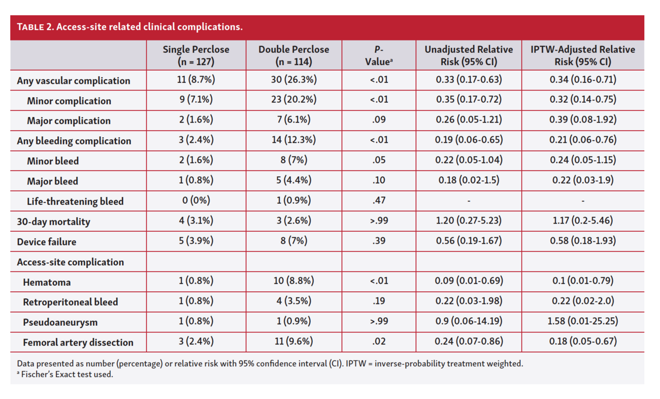 Access-site related outcomes (Figure 1). There were fewer vascular complications (8.7% vs 26.3%; P<.01), minor vascular complications (7.1% vs 20.2%; P<.01), any bleeding complications (2.4% vs 12.3%; P<.01), access-site hematomas (0.8% vs 8.8%; P<.01), and femoral artery dissections (2.4% vs 9.6%; P=.02) in the SP group vs the DP group, respectively. There were no differences in device success rate (96.1% vs 93%; P=.39) or 30-day mortality rate (3.1% vs 2.6% P>.99) in the SP group vs the DP group, respectively. There were no differences in major vascular complications, minor or major bleeding complications, retroperitoneal bleeds, or pseudoaneurysms. After IPTW balancing of baseline and procedural characteristics, the SP technique remained associated with fewer vascular complications (Table 2) (IPTW-RR, 0.34; 95% confidence interval [CI], 0.16-0.71), minor vascular complications (IPTW-RR, 0.32; 95% CI, 0.14-0.75), any bleeding complications (IPTW-RR, 0.21; 95% CI, 0.06-0.76), hematomas (IPTW-RR, 0.1; 95% CI, 0.01-0.79), and femoral artery dissections (IPTW-RR, 0.18; 95% CI, 0.05-0.67).