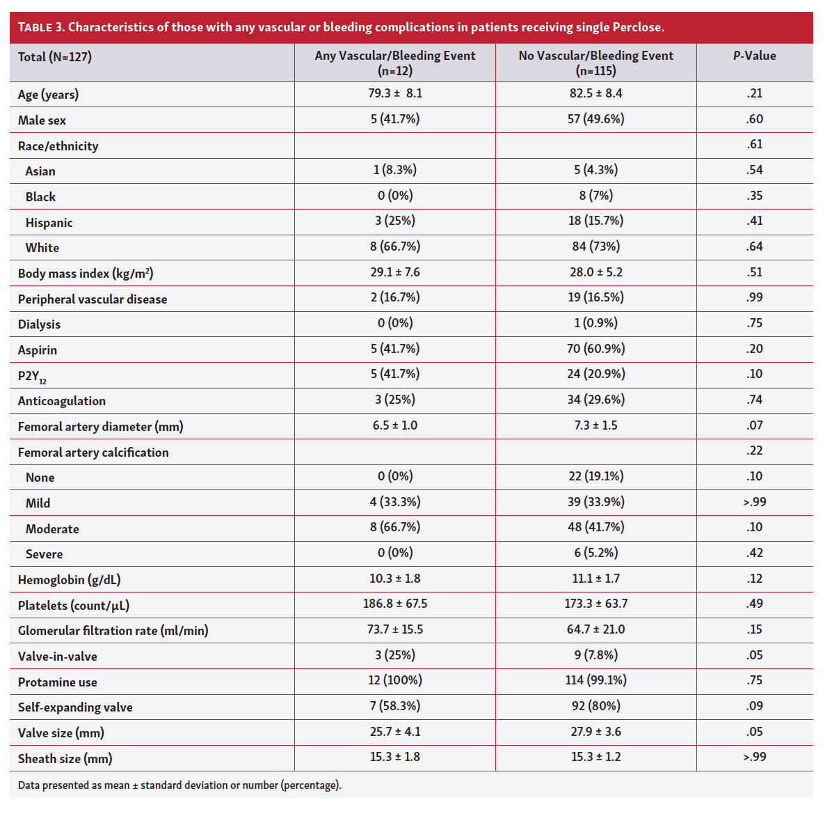 Comparison of patients with vs without vascular/bleeding complications in the SP group. To evaluate for patient characteristics that may be associated with complications, we compared those with any vascular/bleeding events (n = 12) vs no vascular/bleeding events (n = 115) in those receiving an upfront SP device (Table 3). There were no statistically significant differences in baseline characteristics between groups. However, those with any vascular/bleeding complications had a non-statistical trend (all P>.05) toward being Asian race (8.3% vs 4.3%) or Hispanic race (25% vs 15.7%), taking less aspirin prior to TAVR (42% vs 61%), taking more P2Y12 inhibitors prior to TAVR (42% vs 21%), smaller femoral artery diameter (6.5 ± 1.0 mm vs 7.3 ± 1.5 mm), moderate femoral artery calcification (67% vs 42%), valve-in-valve implantation (25% vs 8%), fewer self-expanding valves (CoreValve) used (58% vs 80%), and smaller valve sizes implanted (mean valve size, 25.7 ± 4.1 mm vs 27.9 ± 3.6 mm; 20 mm valve, 16.7% vs 0%; 23 mm valve, 25% vs 19.3%) compared with patients who had no vascular/bleeding complications, respectively. There were no noticeable differences in history of PVD and delivery sheath size.
