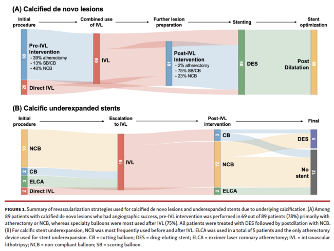 Revascularization approach. Figure 1A summarizes the treatment approaches that led to device success for calcified de novo lesions. IVL was selected as the initial therapy in 22% of patients while pre-IVL intervention was performed in the rest of the patients. The reason for IVL following other techniques was to facilitate IVL catheter delivery or due to incomplete lesion preparation with the initial strategy. Most patients (69%) underwent further lesion preparation primarily with NCB or specialty balloons to ensure sufficient balloon expansion before DES implantation. Figure 1B shows the treatment approaches used for stent underexpansion due to underlying calcification, with 2 out of 17 cases treated with bail-out IVL for acutely underexpanded stents. Similar to those for de novo lesions, other tools were initially used for IVL catheter delivery, or subsequent use of IVL was needed due to insufficient preparation with NCB or ELCA (Figure 2).