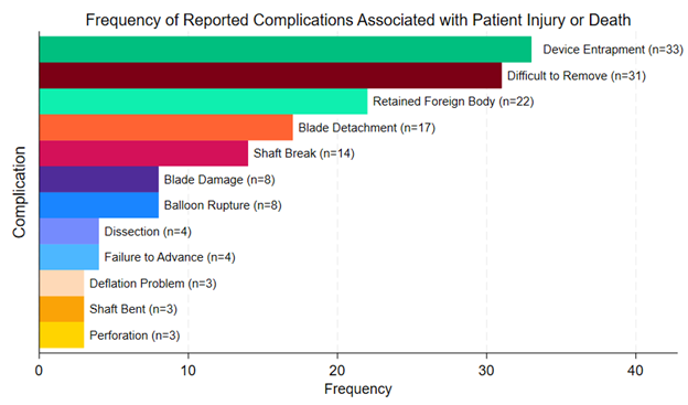 The most frequently reported complication overall was overwhelmingly balloon rupture (n = 1847, 81%), followed by pinhole leak (n = 279, 12%), shaft break (n = 181, 7.9%), shaft bend (n = 129, 5.7%), failure to advance (n = 115, 5.0%), difficult to remove (n = 74, 3.2%), device stuck to guidewire (n = 51, 2.2%), device entrapment (n = 47, 2.1%), and blade damage (n = 46, 2.0%) (Figure 4). A full list of reported complications is provided in the Supplemental Table. Among complications that resulted in patient injury or death, the most common complications were device entrapment (n = 33, 53%), difficult to remove (n = 31, 50%), retained foreign body (n = 22, 35%), blade detachment (n= 17, 27%), shaft break (n = 14, 23%), blade damage (n = 8, 13%), and balloon rupture (n = 8, 13%) (Figure 5). Among complications that resulted in patient death, 3 involved device entrapment, 2 involved dissection, 1 involved perforation, and 1 involved balloon rupture.