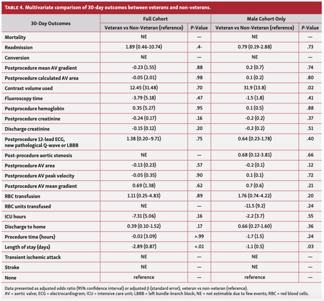 Similar to the overall cohort, univariable comparisons of 30-day outcomes and 1-year outcomes between male-only veteran status cohorts had very few statistically different results (Table 2 and Table 3). However, after controlling for confounding covariates in multivariable analysis of 30-day (Table 4) and 1-year outcomes (Table 5), no significant differences between cohorts were detected aside from overall length of stay, which as described previously does not account for veterans transferred post TAVR from GWU to VAMC for further recovery and thus is not truly representative.