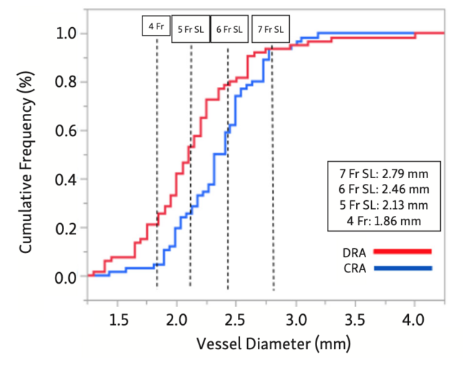 Baseline characteristics are shown in Table 1. The average patient age was 68.8 years (range, 41-84 years). Sixty-three patients (74.1%) were male. Hypertension, diabetes, dyslipidemia, and smoking were present in 72.3%, 56.6%, 56.7%, and 55.3% of patients, respectively. Procedural characteristics are shown in Table 2. The procedure was successful in 81 patients (95.2%). CAG or PCI could not be completed via the DRA in the remaining four patients due to a tortuous subclavian artery. A right-sided approach was used in 75 patients (88.2%). The maximum sheath size was 7-Fr Glidesheath Slender, with an outer diameter of 2.79 mm. Vascular sonography was performed before the procedure in 65 patients (76.5%). The mean diameter of the DRA was significantly smaller than that of the CRA (1.92 ± 0.37 mm vs 2.12 ± 0.53 mm; P<.05). The ratio of the sheath outer diameter (SOD) to the DRA diameter was significantly smaller than the ratio to the CRA diameter (Figure 2). A SOD/CRA ratio ≥1 was noted in 22%, 27%, 49%, and 92% of cases in which 4-Fr, 5-Fr Glidesheath Slender, 6-Fr Glidesheath Slender, and 7-Fr Glidesheath Slender were used, respectively. A SOD/DRA ratio ≥ 1 was noted in 27%, 64%, 91%, and 96% of cases in which 4-Fr, 5-Fr, 6-Fr, and 7-Fr Glidesheath Slender were used, respectively.