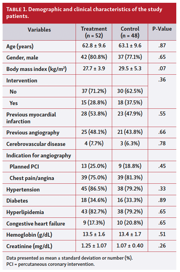 One hundred patients (52 in the treatment group and 48 in the control group) were recruited. Baseline demographic characteristics, including age, gender, body mass index, and previous medical conditions, were well balanced between groups (Table 1). All procedures were performed transradially. The indication for angiography was either evaluation of anginal symptoms or the completion of full revascularization (staged percutaneous intervention). Most procedures did not include coronary intervention (71% in the treatment group vs 63% in the control group; P=non-significant).