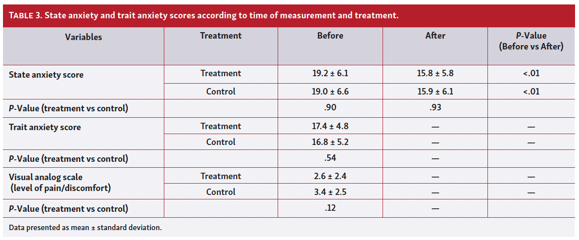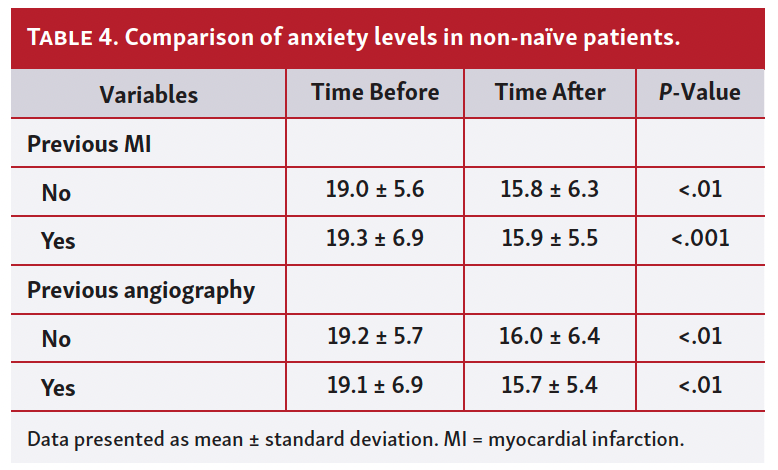 The mean trait anxiety was similar for both groups (17.4 ± 4.8 in the treatment group vs 16.8 ± 5.2 in the control group; P=.54). As expected, anxiety levels were significantly higher in both groups before angiography (19.2 ± 6.1 in the treatment group vs 19.0 ± 6.6 in the control group; P=.90) than post procedure (15.8 ± 5.8 in the treatment group vs 15.9 ± 6.1 in the control group; P=.93), but no effect was noticed that could be attributed to midazolam treatment (Table 3). Furthermore, the patient-perceived level of discomfort/pain was low and similar between the 2 groups (2.6 ± 2.4 in the treatment group vs 3.4 ± 2.5 in the control group; P=.12). Interestingly, anxiety levels were similar in the subgroup of patients who had an angiogram before the index procedure, or myocardial infarction, compared with naïve patients (Table 4). None of the patients required additional sedation/analgesia following the administration of the study drug or placebo.