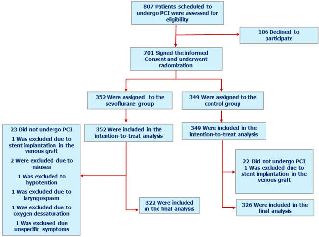 Clinical, demographic, and procedure characteristics. Between February 2017 and September 2019, 807 consecutive patients were screened for eligibility. A total of 701 patients signed the informed consent and were enrolled (352 in the sevoflurane group and 349 in the placebo cohort). After randomization, 53 patients (7.5%) were excluded from the final analysis (30 in the active cohort and 23 in the control group). The Figure displays the study flowchart. Demographic and clinical characteristics were comparable between the cohorts, except for the body mass index, which was slightly higher in the placebo group (28.94 ± 4.79 vs 27.90 ± 4.33) (Table 1).