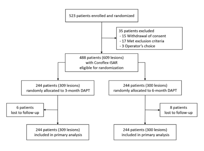 In the stents used to treat diseased coronary artery segments, the polymeric coatings, applied to facilitate drug release, may trigger an inflammatory reaction and thus delay arterial healing and promote thrombosis.9,10 New-generation DESs were designed to overcome this problem via the use of either more biocompatible polymer coatings or polymer-free DESs.11,12 However, whether a very short course of DAPT is sufficient in patients treated with a polymer-free DES remains unclear. The aim of the ISAR-DAPT (A Comparative Evaluation of Efficacy and Safety in the 3-Month DAPT Group vs the 6-Months DAPT Group of Patients Treated with the Coroflex ISAR Stent) study was to investigate the safety of 3 months, rather than 6 months, of DAPT in patients implanted with a polymer-free DES.