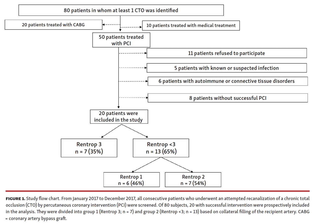 Occlusion duration was evaluated considering previous coronary angiographies, date of a prior myocardial infarction, or onset of symptoms.6-8 All patients were symptomatic for angina or had documented ischemia and viability in myocardial regions supplied by the CTO vessel. Patients with contraindications to antiplatelet therapy, known or suspected infection, inflammatory, autoimmune disease, and connective tissue disorders, were excluded.9 For the CTO-PCI, the second-generation zotarolimus-eluting Resolute Integrity stent (Medtronic) was used in all patients. Following PCI, all patients were prescribed clopidogrel for at least 6 months and lifelong aspirin.