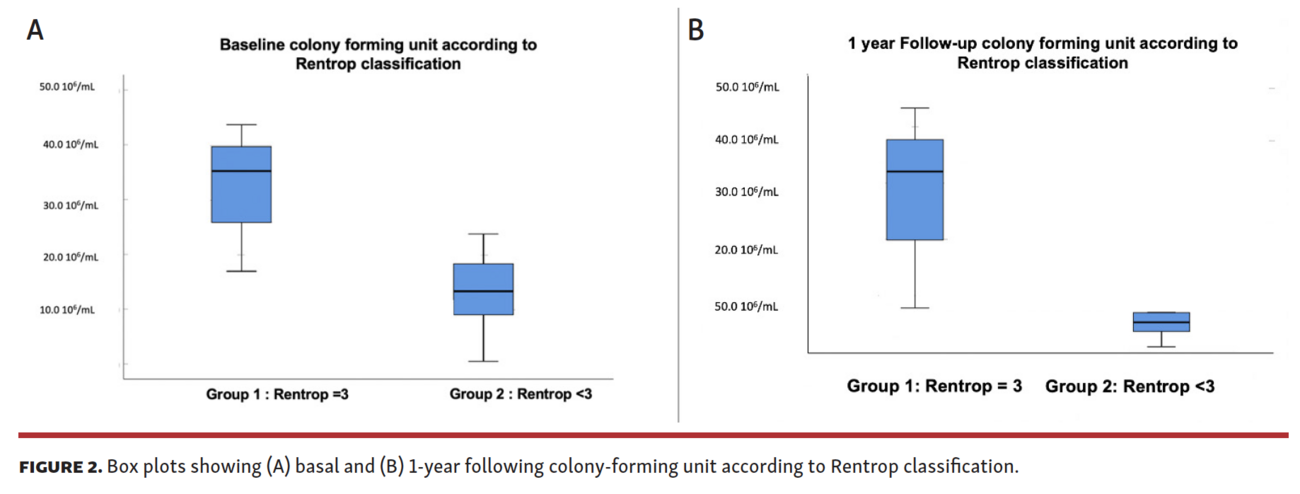 ΔCFU was computed as difference between B-CFU and F-CFU. ΔCFU% was defined as (ΔCFU/ B-CFU) x 100. The interobserver variability in CFU counts was 4.2 ± 1.4%.