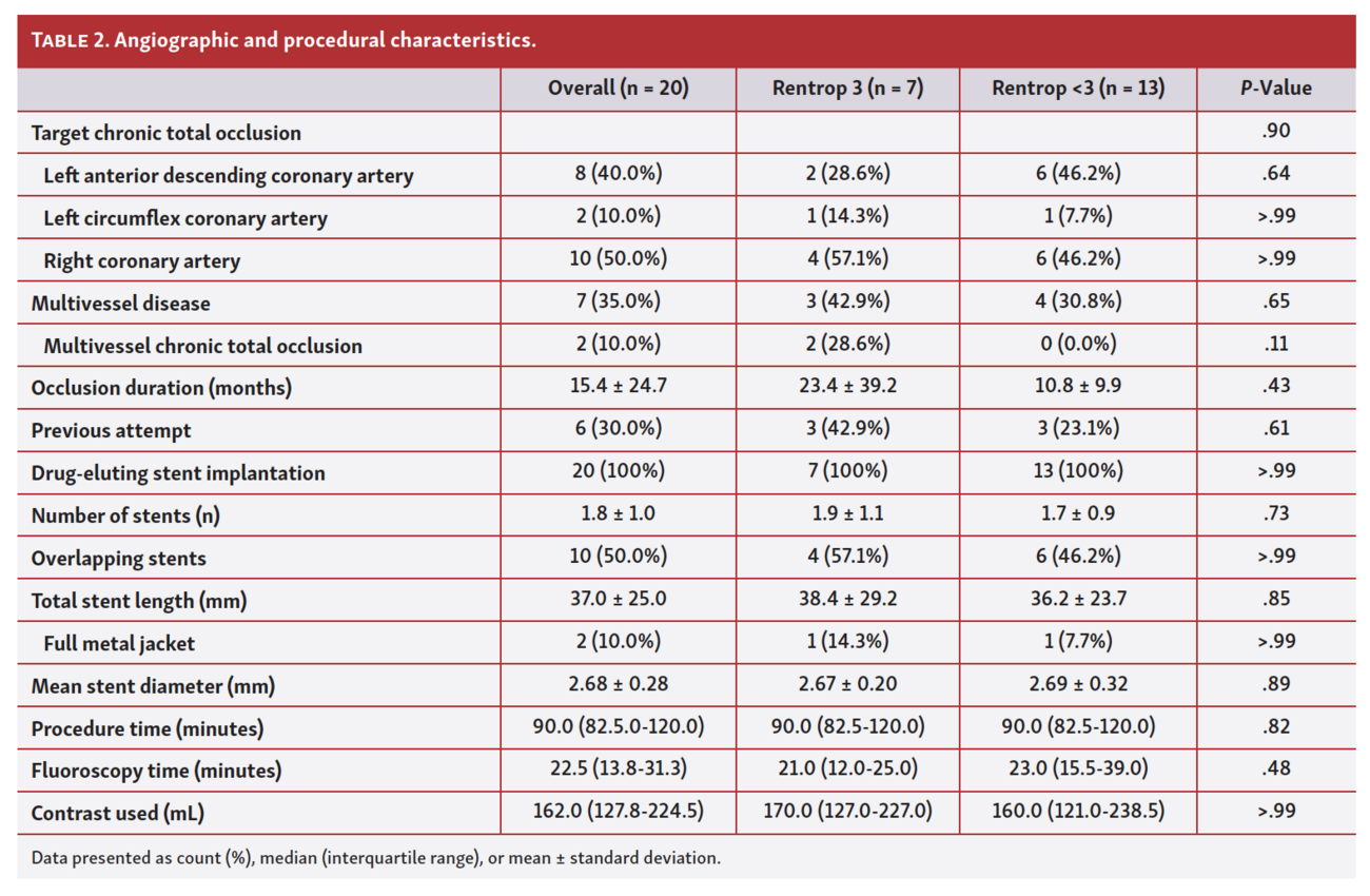 Angiographic and procedural variables. Across the study population, the CTO lesions were more frequently located at the right coronary artery, but the 2 groups did not differ in CTO coronary location, occlusion duration, or multivessel disease. CTO occurred simultaneously with Rentrop grade 3 in 2 patients; both were successfully treated with PCI. No significant difference in the rate of multivessel disease was observed between Rentrop 3 vs Rentrop <3. Two patients had 2 CTOs with Rentrop grade 3 in each lesion; both lesions were successfully treated with PCI in 1 patient while the other patient had concomitant moderate coronary disease and conservative management was adopted. In the Rentrop <3 group, 4 patients had concomitant intermediate multivessel coronary artery disease not requiring PCI. The mean number of stents implanted was 1.8 ± 1.0. Overlapping stents were implanted in 50% of the study population (n = 10). Size, length, and number of stents, procedural time, fluoroscopy time, and contrast volume did not differ between groups (Table 2). CTO-PCI was successfully performed by antegrade wire escalation technique in all patients with Rentrop < 3. In the Rentrop 3 group, the retrograde wire escalation technique was successfully accomplished in 2 patients and antegrade wire escalation was used in the remaining patients. In subgroup analysis, those with Rentrop grade 1 did not differ from those with Rentrop grade 2 in these angiographic variables (Supplemental Table S2).