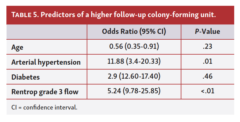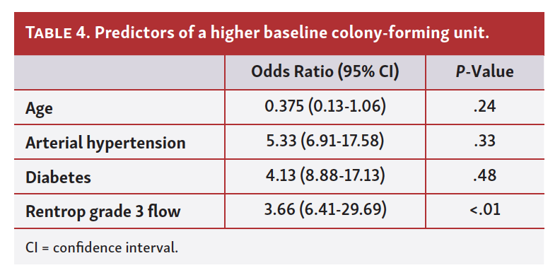 A multivariable model was used to assess independent predictors of B-CFU and F-CFU by using as dependent variables age, hypertension, diabetes, and Rentrop class (3 vs others). Our approach was to include in the multivariate model all those variables that could be clinically related with the number of CFUs, such as age, occlusion time, diabetes mellitus, hypertension, and Rentrop grade. A 2-sided P-value <.05 indicated statistical significance in the multivariable analysis. Statistical analyses were performed by SPSS software, version 25.0 (SPSS).