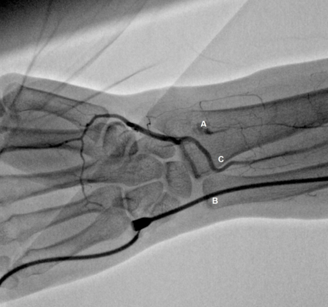 Rodrígues-Olivares evaluated the vascular anatomy of the forearm of a small sample of 14 patients submitted to transulnar approach, whose radial artery was occluded. During forearm angiography, it was evidenced that the patients presented simultaneous occlusion of the radial (chronic occlusion) and ulnar arteries (temporary occlusion due to insertion of the introducer sheath). Despite the 2 occluded arteries, no patient presented signs or symptoms of acute ischemia of the hand during the procedure, because the palmar arch was vascularized by small collaterals, all originating from the interosseous artery and leading to more than 1 region of the hand. More often, the collaterals were emitted to the radial artery, in the distal portion of the occlusion, with direct insertion to the palmar arch. After 26 months of follow-up, all patients maintained the previous ulnar pulse and no signs of hand ischemia or ulnar nerve injury were observed. These results suggest that the development of collaterals occur acutely.11
