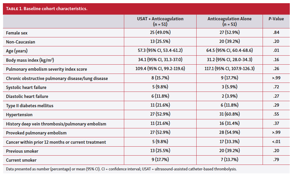 Baseline patient characteristics. Based on the inclusion criteria, we identified 102 consecutive adult patients with submassive PE who were considered for USAT between November 2016 and May 2019. Of those, 51 patients received USAT therapy while 51 received AC alone. Baseline characteristics are shown in Table 1. Patients in the intervention group were younger (mean age, 57.3 years [SE, 1.93] in the USAT group vs 64.5 years [SE, 2.03] in the AC group; P=.01), and more likely to be male (51.0% males in USAT group vs 47.1% in the AC group; P=.84). Comorbidities were largely similar between the 2 groups (Table 1); however, malignancy was more common in patients treated with AC alone (9.8% in the USAT group vs 33.3% in the AC group; P<.01). Mean PESI scores were similar (109.4 [SE 5.1] for the USAT group vs 117.1 [SE, 4.6] for the AC group; P=.26). A backward stepwise logistic regression of demographic and risk factors found that patients were less likely to be treated with USAT if they had a prior malignancy (odds ratio [OR], 0.25; 95% CI, 0.08-0.79; P=.01) and were age 80 or older (OR, 0.10; 95% CI, 0.012-0.91; P=.04), while patients with a period of prolonged immobility preceding presentation were more likely to be treated with USAT (OR, 2.24; 95% CI, 1.27-12.31; P=.08).