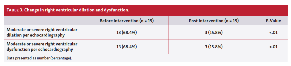 Data for RV dilation and dysfunction and directly transduced PA pressures were only included if there was a pre- and postintervention value available for the patient (dilation/dysfunction n = 19; PA mean n = 42; PA systolic n = 30). Means for pre- and postintervention PA pressures were calculated and compared via paired 2-sample t-tests in JMP Pro 14.