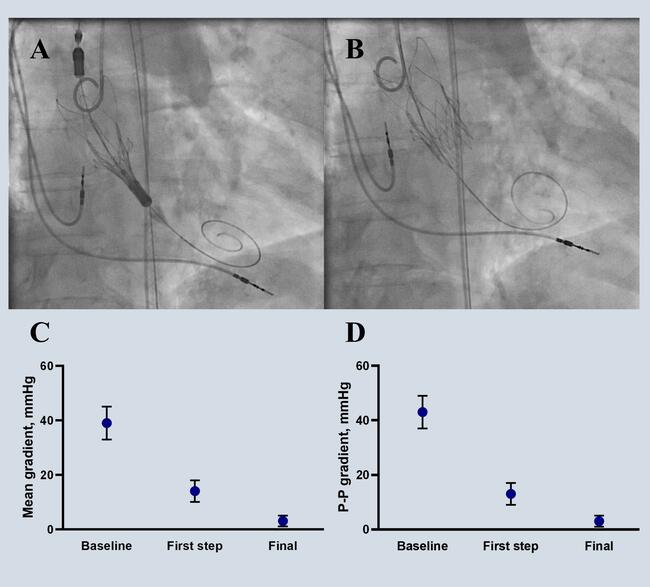 Among the Neo subgroup, there was a significant reduction in transvalvular peak-to-peak gradients after the first step for deployment: 42.5 (42-48.5) mm Hg baseline vs 13 (10-16) mm Hg after the first step. After full deployment, residual transvalvular gradients were insignificant (mean and peak-to-peak gradients of 3 mm Hg) (Table 4).