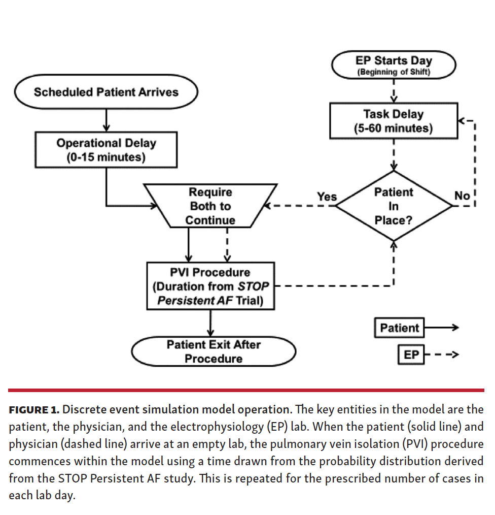Discrete event simulation model operation. A discrete event simulation model was used to evaluate EP lab utilization based on PVI ablation procedure lab occupancy times reported in the STOP Persistent AF trial. Discrete event simulations are designed to model the complexity of interactions among different entities in a real-world system and have been used to model the efficient use of resources in various healthcare settings.12,13 These simulations are based on a stochastic time series of individual, granular events representative of realistic occurrences. Entities in a discrete event simulation (eg, people or critical resources) are treated distinctly from each other, having unique characteristics and memory, and are drawn from a detailed probabilistic characterization derived from real-world data and experience. SIMUL8 professional version 26.0 (SIMUL8 Corporation) was used for the discrete event simulation in this analysis.
