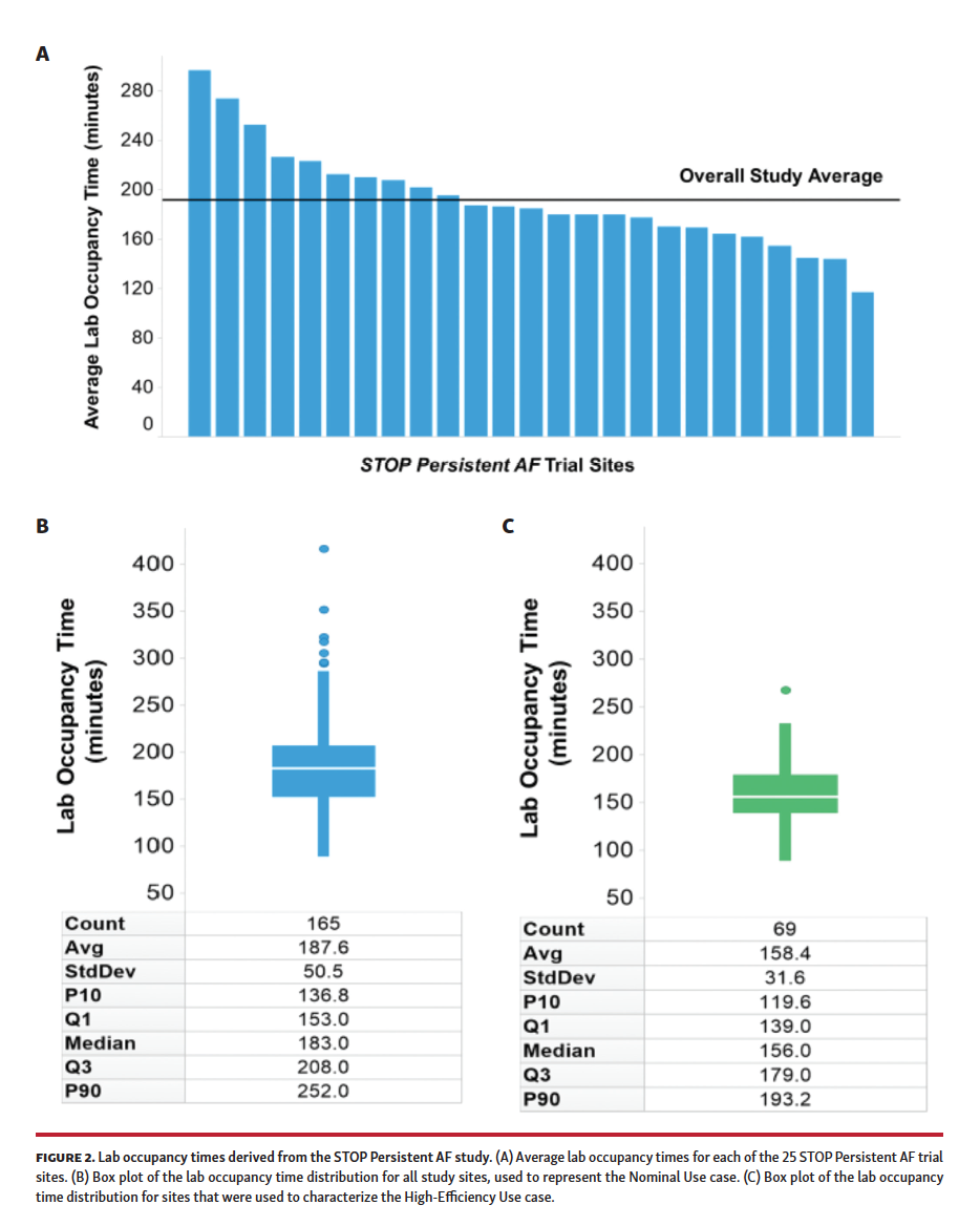 Historically, AF ablation procedures were relatively long and unpredictable in duration.4,9,10 Also, AF ablation procedures require specialized expertise, facilities, and equipment. The growing AF population combined with the required specialty equipment necessitates intentional management of limited hospital resources. Since initial publications, which reported improved lab efficiencies with the use of the cryoballoon compared with point-by-point radiofrequency (RF) ablation catheters,10,11 operator experience with cryoablation has grown and technological advancements in cryoablation have contributed to reduced PVI procedure times.6,8 However, the impact of operator experience, technological advancement, and the expanded PsAF indication on electrophysiology (EP) lab efficiency is unknown. Thus, this analysis was designed to evaluate EP lab utilization afforded by the cryoablation system for the treatment of patients with PsAF and to assess mechanisms that improve lab throughput and optimize hospital resources.