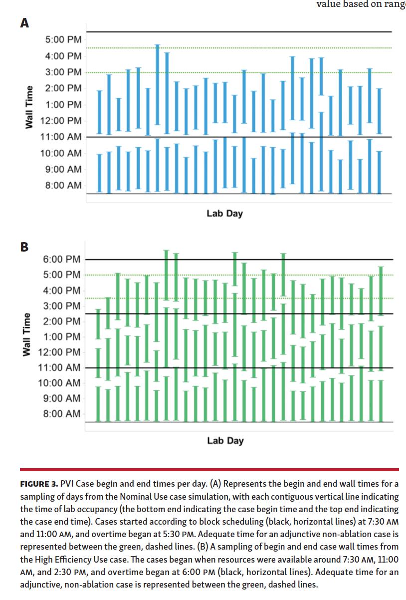 Influence of operations on lab efficiency. Representative simulated case time distributions are included in Figure 3. Wall times for the beginning and end of lab occupancy were similar between study data and simulated cases (Supplemental Figure S2). Low-efficiency lab occupancy time (used only for this sensitivity analysis) was derived from 41 procedures (37 PVI only, 4 PVI and flutter ablation) and averaged 215 ± 42 minutes.