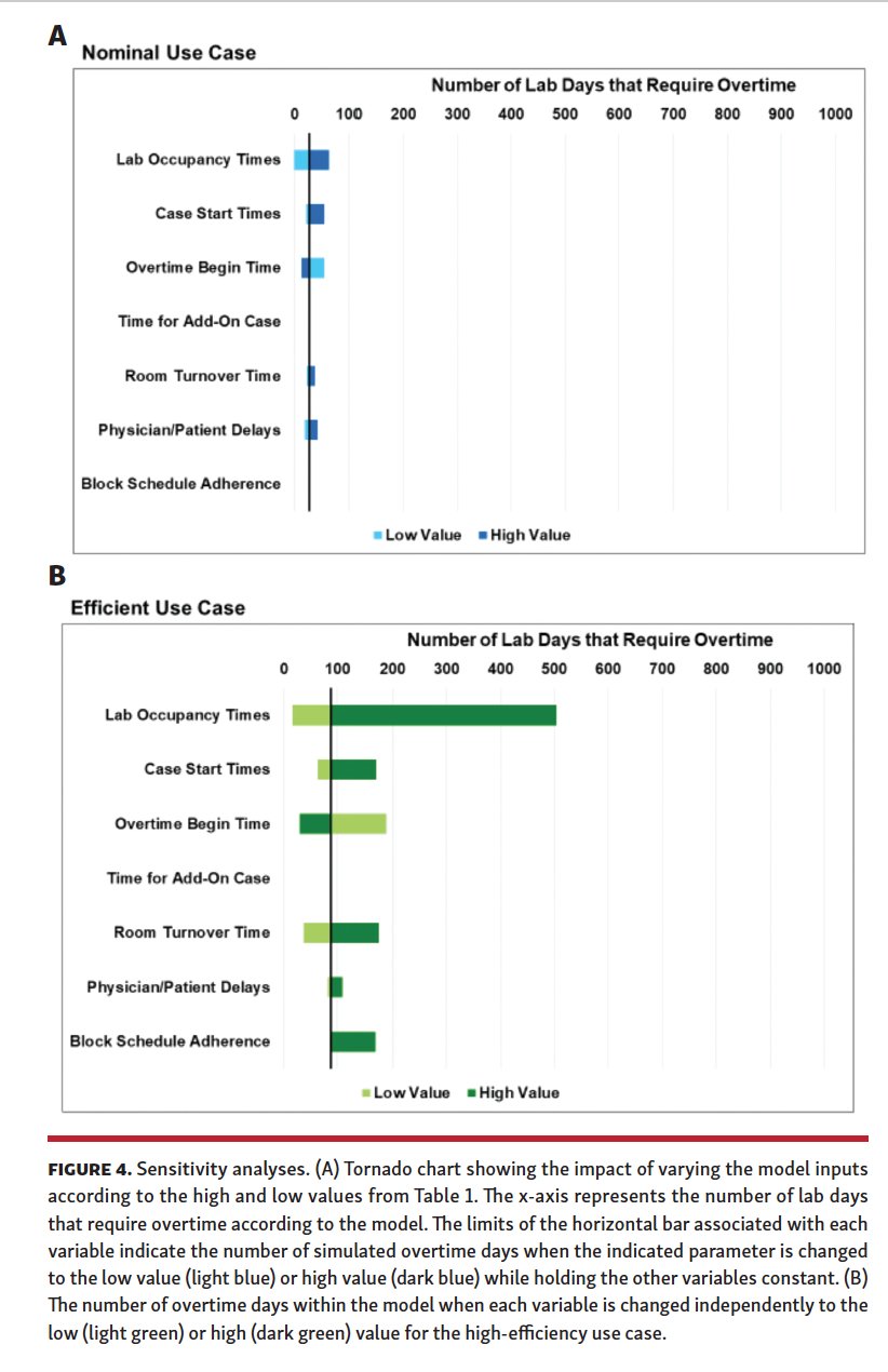 The results of the sensitivity analysis for the overtime days metric are shown in Figure 4, and the results for 1 and 2 add-on case metrics are shown in Supplemental Figure S3. The discrete event simulation model was most sensitive to changes in lab occupancy time distributions, followed by changes in the time of day both cases and overtime started. There was a higher incidence of overtime and fewer days with add-on procedures when lab occupancy times were longer, cases started later, and overtime started earlier in the day.