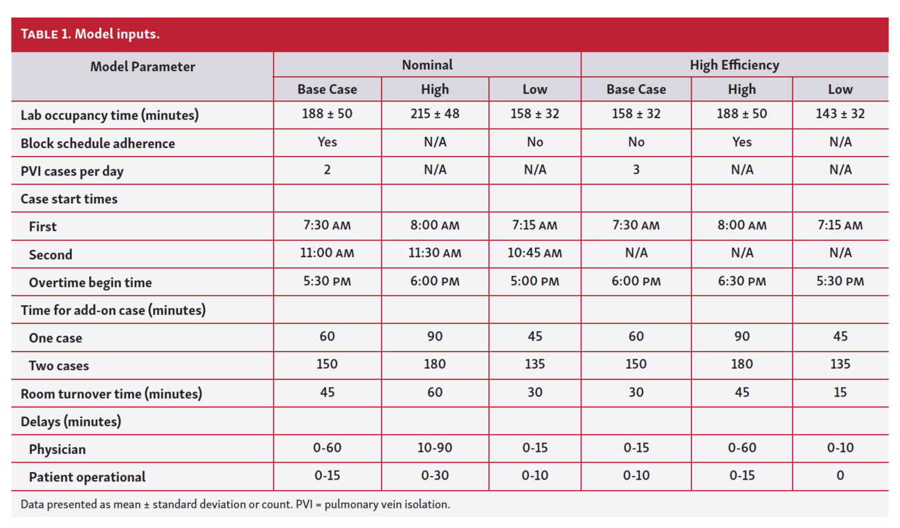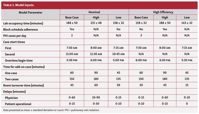 Model inputs. Lab occupancy times were derived from the STOP Persistent AF clinical study and represented a weighted blend of PVI-only cases and those with right atrial flutter line ablation in addition to PVI. Two distinct simulations were created and compared: (1) the nominal use (NU) case represented a standard EP schedule designed to complete 2 PVI cases in a day; and (2) the high-efficiency use (HEU) case represented an enhanced schedule designed to complete 3 PVI cases in a day. The primary analysis for the NU and HEU cases was denoted as the base case analysis (Table 1). For both NU and HEU base case analyses, the first PVI case was scheduled for 7:30 am, and 60 and 150 minutes were required at the end of the day for 1 and 2 add-on, non-ablation cases in the EP lab, respectively.