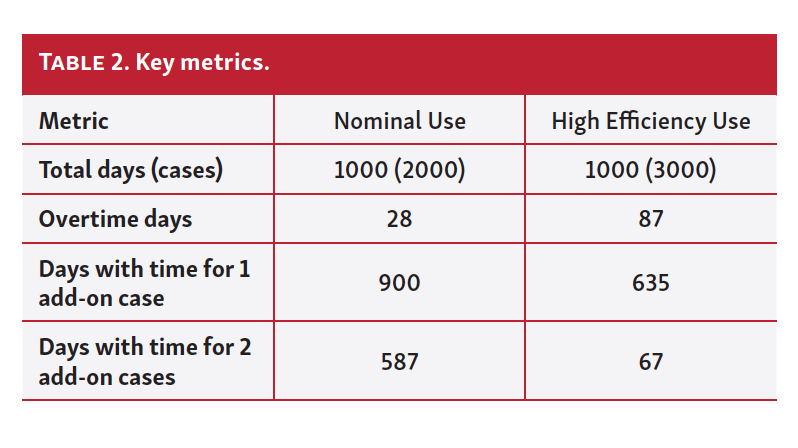 While 3 PVI cases per lab day is not currently the normal condition, this model demonstrates it is achievable with keen focus on 2 operational areas. Overall lab occupancy time had the greatest impact on EP lab throughput. Optimizing lab occupancy time may begin with reasonable and consistent improvements in “skin-to-skin” procedure time, which can be influenced by catheter technology choice and the associated ablation modality learning curve for the operator and staff. The cryoballoon catheter may support reductions in lab occupancy time as both procedure times and operator learning curve have been demonstrated to be shorter than focal RF ablation catheters.19,21 Additional procedural options like adoption of tailored dosing for cryoablation procedures may further enhance procedural efficiency.15,16 The second operational area that most influenced lab efficiency was the overall scheduling approach of the ablation day in the EP lab. Adjustments to enhance efficiencies in the lab schedule could include extending the length of standard lab hours per day (ie, earlier first case start time and later overtime start) by instating split nursing shifts, improving the efficiency of room turnover processes, and removing the restriction in subsequent case start times imposed by block scheduling.