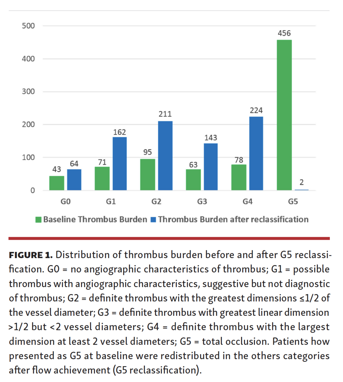 Angiographic analysis. Intracoronary thrombus was angiographically evaluated and classified into 6 grades in accordance with TIMI thrombus grade classification:8 grade 0 (G0) = no angiographic characteristics of thrombus are present; grade 1 (G1) = possible thrombus is present, with such angiographic characteristics as reduced contrast density, haziness, irregular lesion contour, or a smooth convex meniscus suggestive but not diagnostic of thrombus; grade 2 (G2) = definite thrombus with greatest dimensions ≤1/2 of the vessel diameter; grade 3 (G3) = definite thrombus with greatest linear dimension >1/2 but <2 vessel diameters; grade 4 (G4) = definite thrombus with the largest dimension at least 2 vessel diameters; grade 5 (G5) = total occlusion.