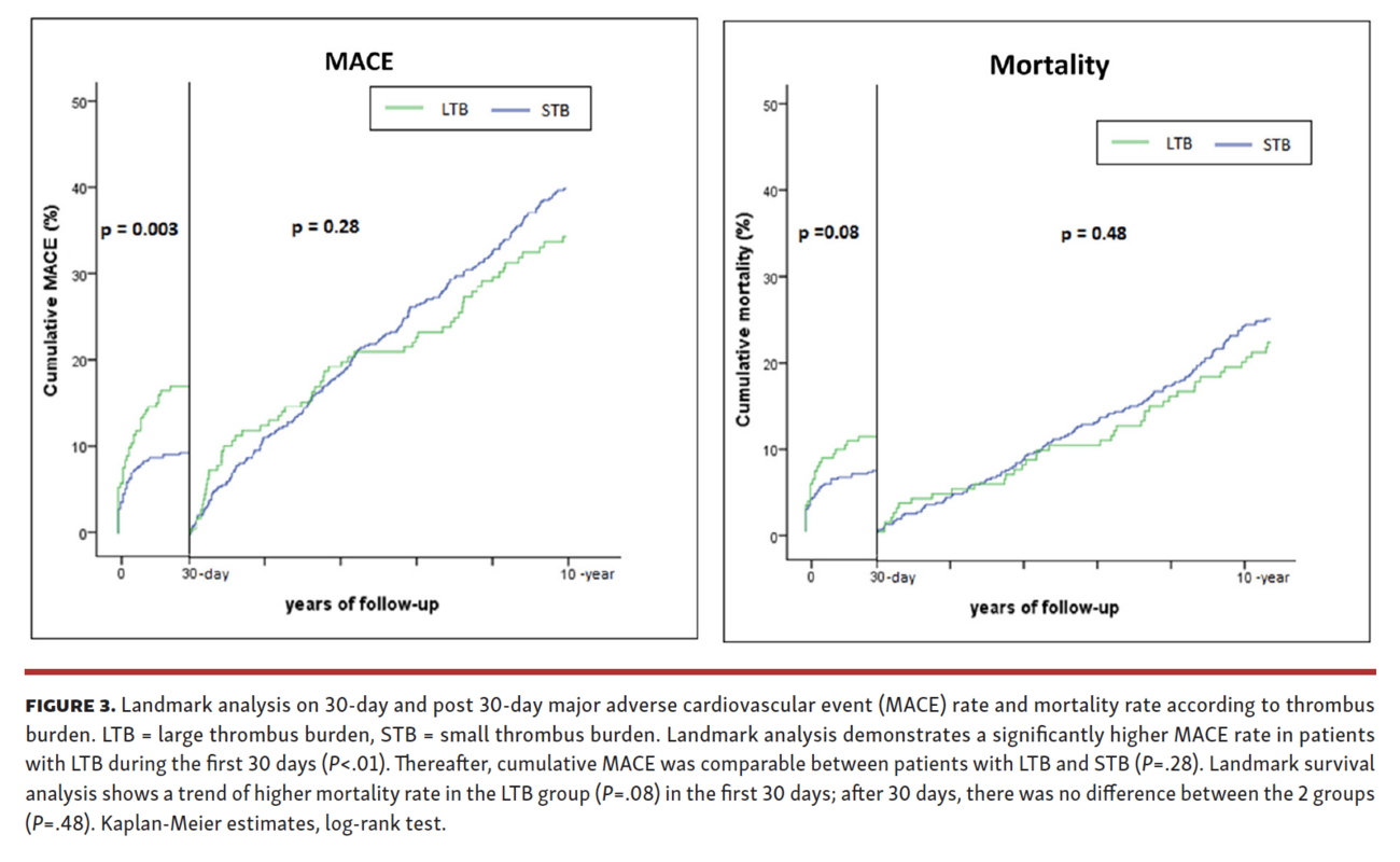 The landmark analysis for MACE demonstrated a significantly higher rate of events in patients with LTB at short term (30 days) in comparison with patients with STB (15.9% vs 8.8%, respectively; P<.01). Thereafter, rates of MACE were comparable between patients with LTB and STB (31.6% vs 36.9%, respectively; P=.28) (Figure 3).