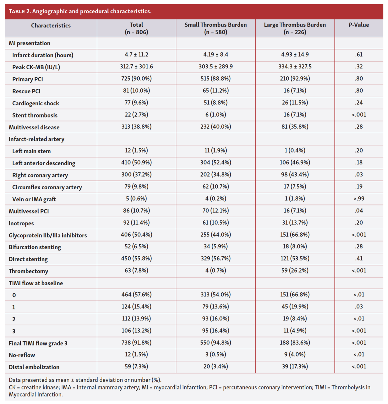 In patients with ST-segment elevation myocardial infarction (STEMI) undergoing primary percutaneous coronary intervention (PCI), large thrombus burden (LTB) is associated with distal embolization, no reflow, and impaired reperfusion translating into larger infarct size.1-7 Thrombus burden (TB) is classified by visual angiographic assessment of the thrombus size compared to the diameter of the infarct-related vessel.2 The Thrombolysis in Myocardial Infarction (TIMI) thrombus classification consists of 6 grades from grade 0 (no thrombus) to grade 5 (total occlusion).8 Grade 5 represents an occluded infarct-related artery (IRA) and prevents thrombus size assessment. To overcome this limitation, Sianos et al proposed to reclassify grade 5 after guidewire crossing or small (diameter, 1.5 mm) deflated balloon passage or dilation; LTB was then defined as ≥2 vessel diameters.4