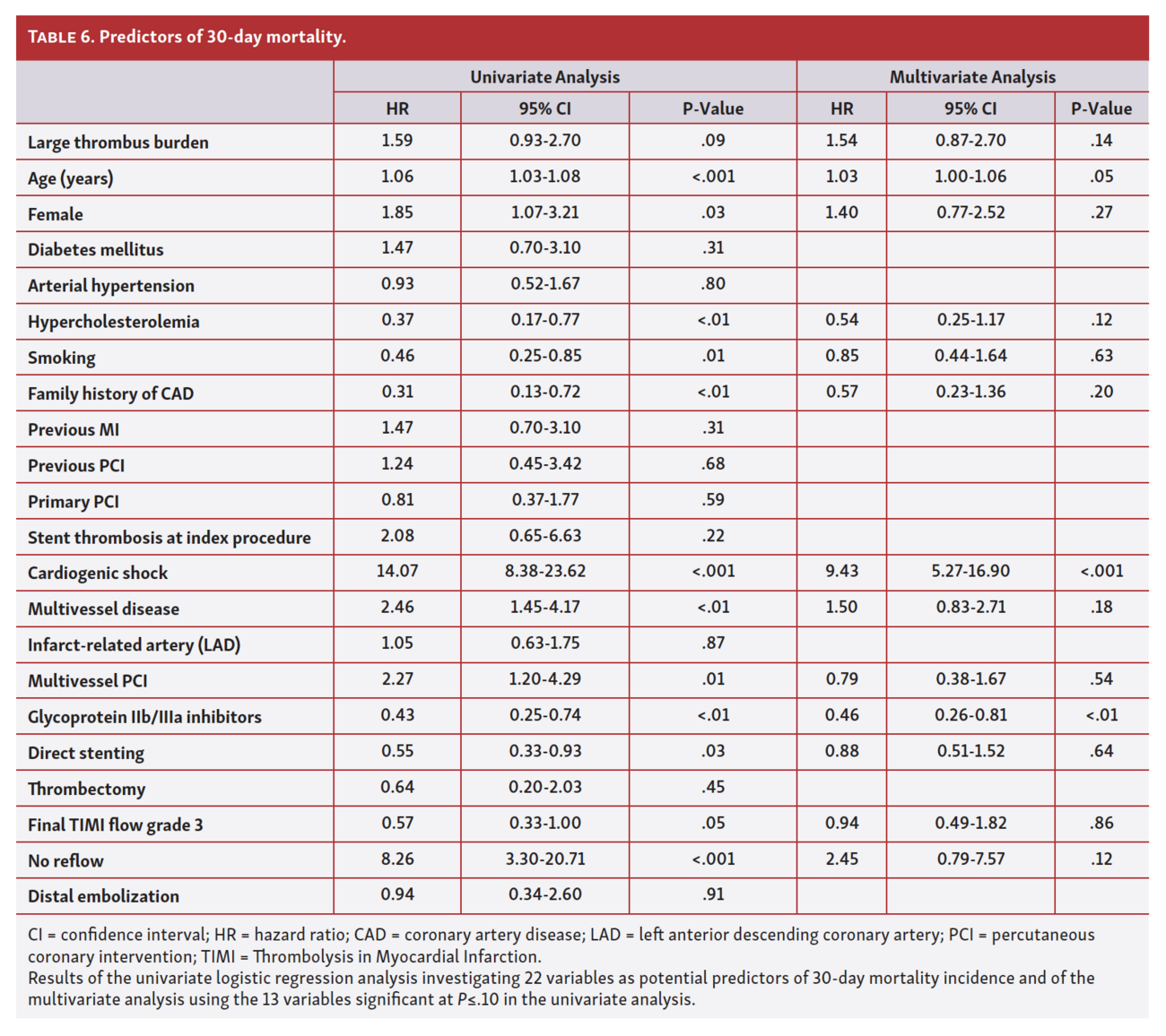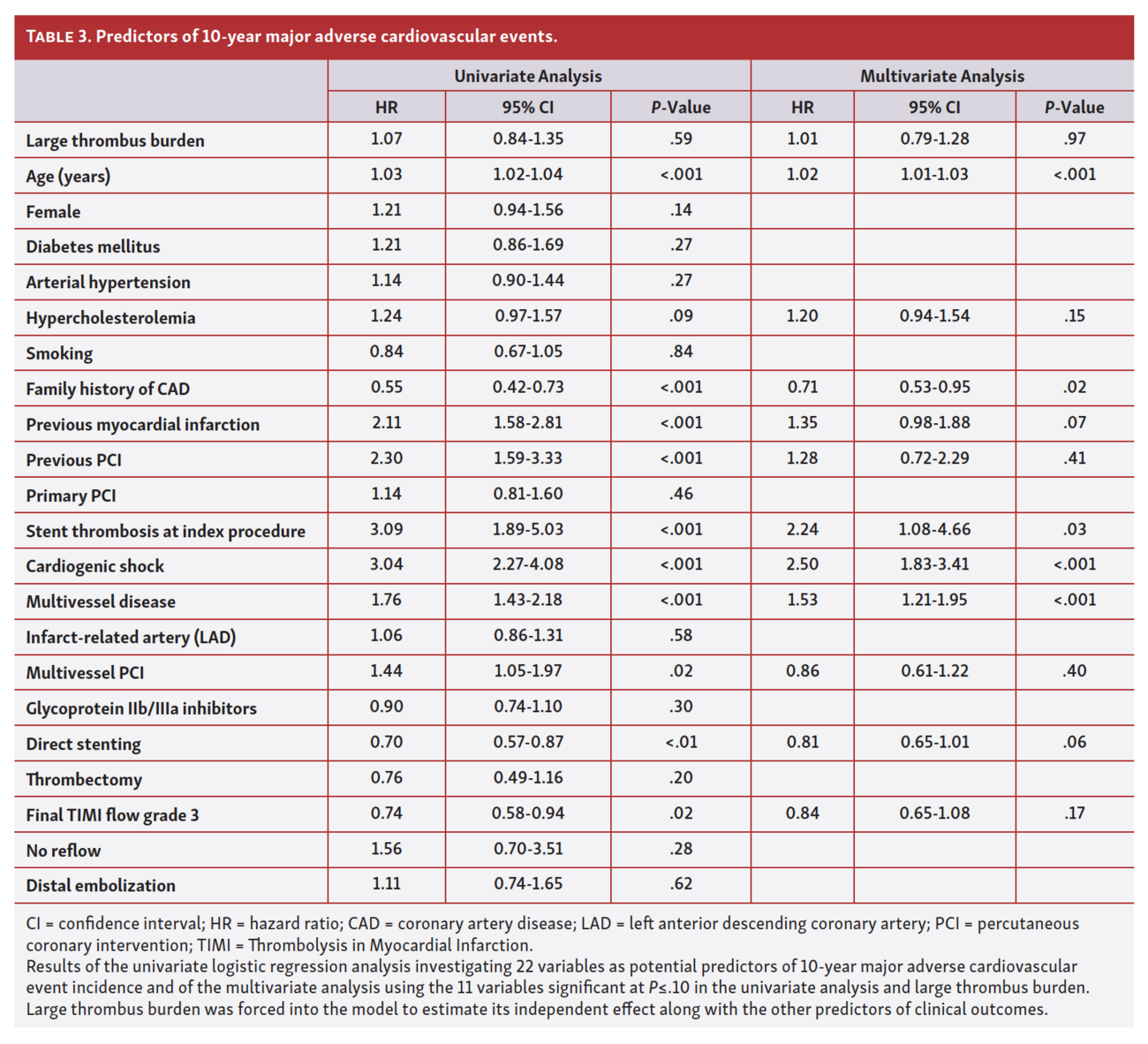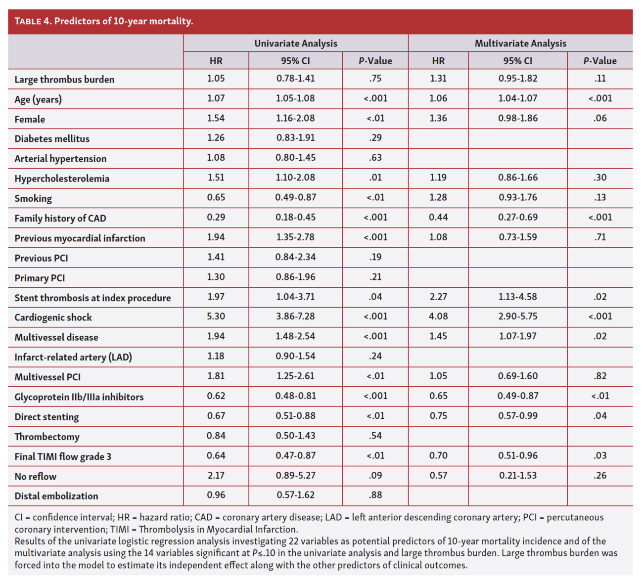 LTB was not an independent predictor of MACE at 10 years (HR, 1.01; 95% CI, 0.79-1.28; P=.97) (Table 3) or 10-year mortality (HR, 1.31; 95% CI, 0.95-1.82; P=.11) (Table 4). LTB was an independent predictor of 30-day MACE (HR, 1.60; 95% CI, 1.01-2.51; P=.04) (Table 5), but not of 30-day mortality (HR, 1.54; 95% CI, 0.87-2.70; P=.14) (Table 6).