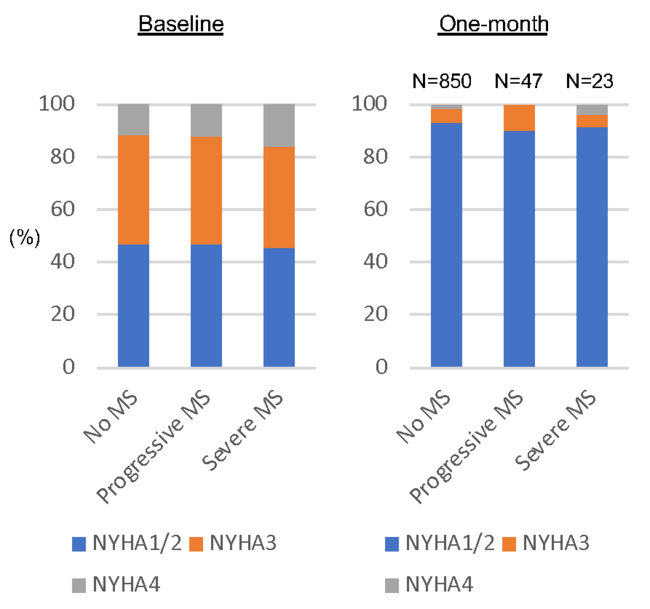 Other periprocedural outcomes were also comparable between groups (Table 2), and NYHA class improved similarly in all groups (Figure 1). Among patients with severe MS at baseline, 12 patients were classified as having progressive MS at 1-month follow-up. Conversely, 11 patients initially classified as having progressive MS were characterized as having no MS, while 5 patients were characterized as having severe MS at 1-month follow-up.