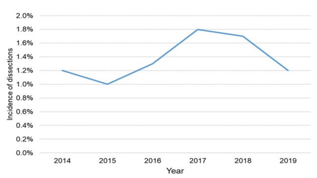 Limitations of our study include its retrospective observational design. Mild, non-flow limiting dissections may not have been reported, potentially leading to an underestimation of the true incidence of coronary dissections. There was no core laboratory assessment of the study angiograms or clinical event adjudication.