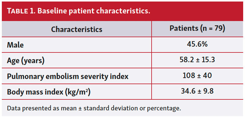 Eighty-seven patients presenting with submassive PE were screened for this study. Six patients with massive PE requiring vasopressors or ECMO were excluded. These are not submassive PEs and should not be discussed. Eighty-one patients presenting with submassive PE were screened for this study. One patient (1.2%) was excluded because CDT was followed by mechanical thrombectomy, and 1 patient who underwent unsuccessful CDT therapy at an outside hospital with unclear dosing regimen before transfer to the study center for additional CDT was excluded. A total of 79 patients were analyzed. Baseline patient characteristics are shown in Table 1. The median t-PA infusion time was 24 hours (range, 9.5-114 hours).