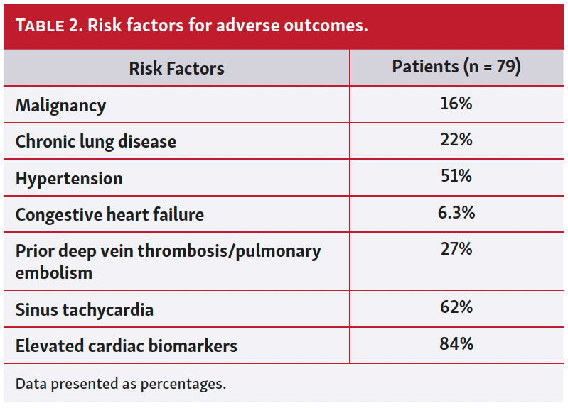 Eight patients (10%) were readmitted to a hospital within 30 days of discharge, including 6 admissions due to cardiopulmonary complications. These included 2 events of recurrent PE, 2 events of syncope, 1 event of hypotension and dyspnea of unclear origin, and 1 event of severe tachycardia necessitating in-hospital management. Two patients were readmitted for non-cardiopulmonary reasons, which included back pain and non-healing lower-extremity wounds.