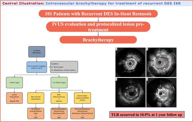 Methods. This multicenter study retrospectively analyzed 101 patients who presented for percutaneous intervention of recurrent drug-eluting stent ISR using IVBT from 2019 to 2023. The primary outcome assessed was target lesion revascularization (TLR) at 1 year. Secondary endpoints were aimed to establish procedural safety. All lesions had evaluation by either angiography, intravascular ultrasound, or both.
