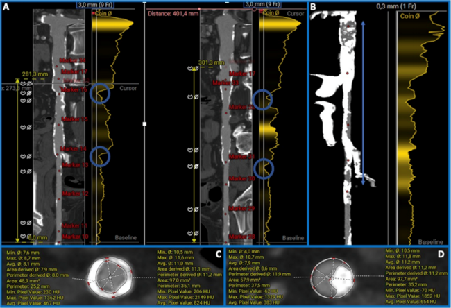 - Longitudinal distribution of calcifications: from the “stretched-vessel” view, using the filter for calcifications, the maximum length of the calcified wall across the entire diseased segment was measured as the percentage of calcium length over the vessel length (defined as diffuse calcifications when > 50%) (Figure 2).