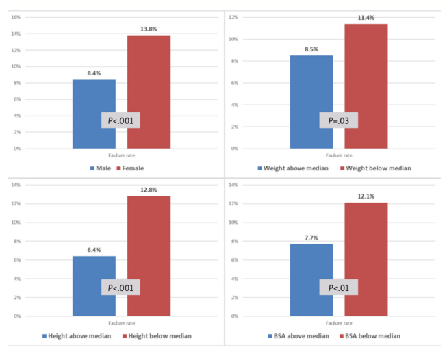 Age was positively associated with procedural failure (69 years [IQR, 60-76] in cases with failure vs 66 years [IQR, 58-74] in cases without failure; P=.03). Small stature was a powerful univariate correlate of procedural failure in terms of weight, height, and body surface area (Figure 3). In patients with height greater than the median, procedural failure was 53.3% less likely (95% confidence interval [CI], 35.6-66.1; P<.001) compared with patients with height lower than the median. The corresponding figures for body weight and body surface area were 28.1% (95% CI, 3.1-46.6; P=.03) and 39.2% (95% CI, 17.7-55.0; P<.01), respectively. Women were 75.2% more likely to have vascular-access-related procedural failure (95% CI, 28.9-138; P<.001) (Figure 3). However, after adjustment for height, this correlation was no longer significant (adjusted hazard ratio, 1.29; 95% CI, 0.89-1.87; P=.18).