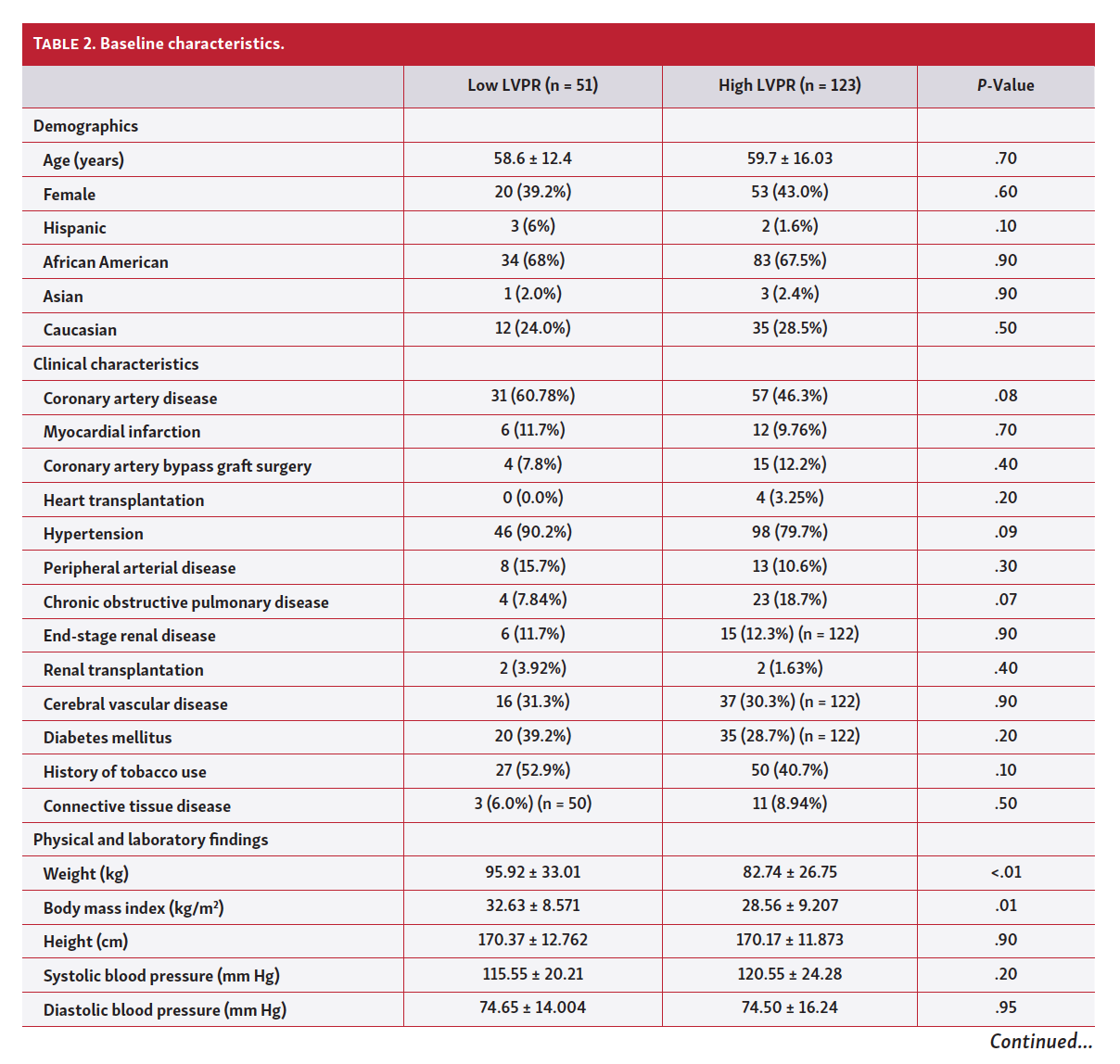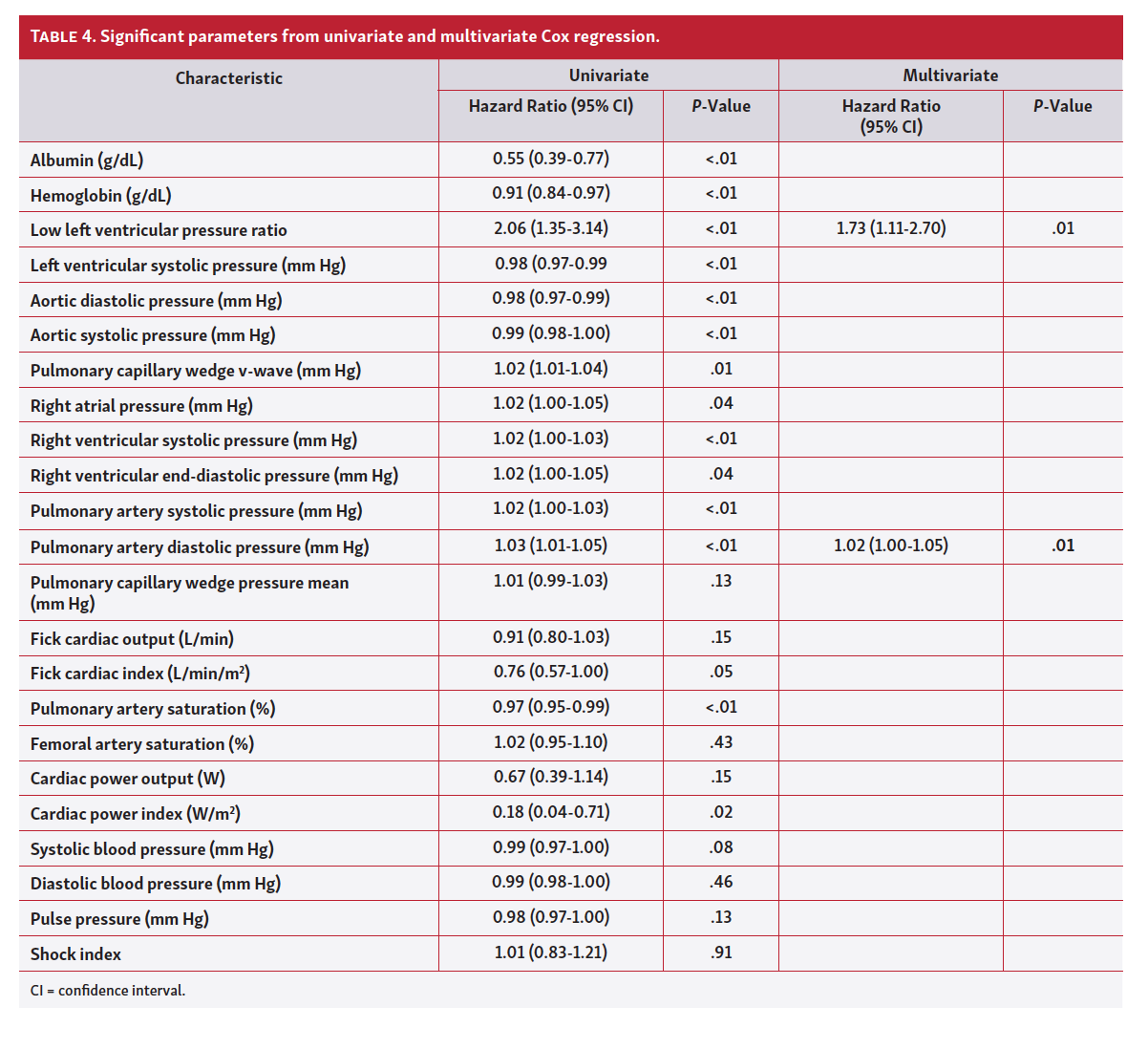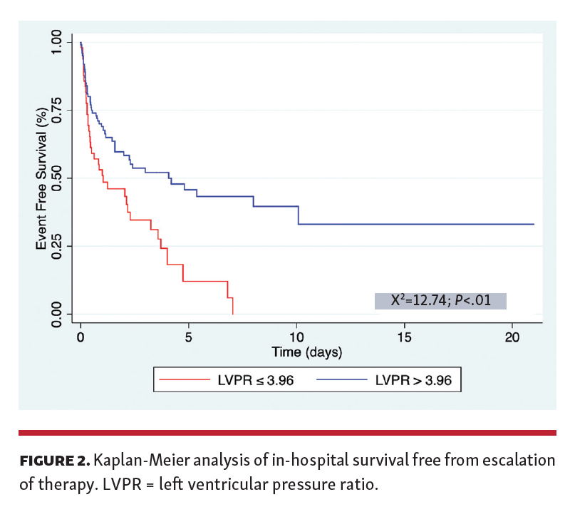 Univariate analysis highlighted several factors significantly correlated with the primary outcome (Table 4). Low albumin and hemoglobin, right ventricular end-diastolic pressure, pulmonary artery systolic pressure, pulmonary artery saturation, LVSP, aortic systolic and diastolic pressures, and low LVPR were associated with the primary outcome. In multivariate analysis, only low LVPR (hazard ratio, 1.73; 95% CI, 1.11-2.70; P=.01) and pulmonary artery diastolic pressures (HR, 1.02; 95% CI, 1.00-1.05; P=.01) were associated with the primary outcome. However, the 95% CI of the pulmonary artery diastolic pressure hazard includes 1, and is therefore not as strong of an association as that of low LVPR.