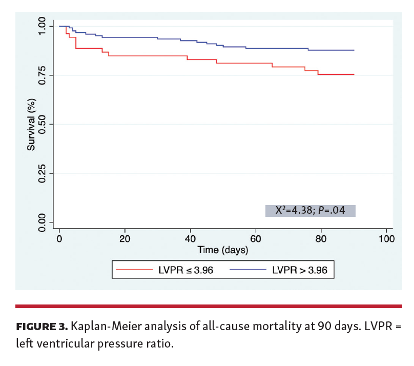 Kaplan-Meier analysis was performed to assess and compare the primary outcome between the low LVPR and high LVPR cohorts. Low LVPR was associated with a lower in-hospital survival free of escalation of therapy compared with high LVPR (0.0% vs 33.0%; 95% confidence interval [CI], 18.0-49.9; Chi2=12.74; P<.01) (Figure 2). In addition, low LVPR was associated with lower 90-day survival compared with high LVPR (74.5% [95% CI, 60.2-84.3] vs 87.8% [95% CI 80.6-92.5]; Chi2=4.38; P=.03) (Figure 3).