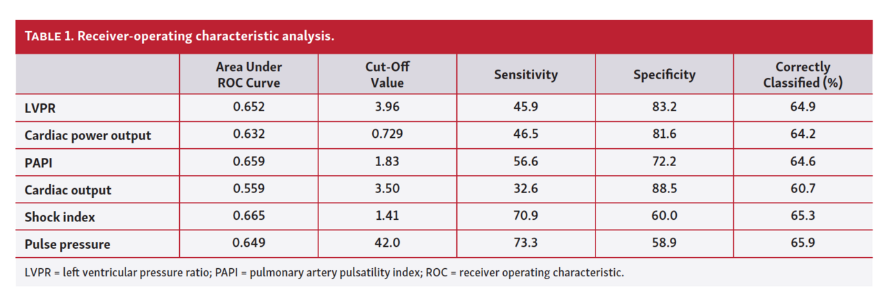 Baseline characteristics, clinical characteristics, and physical characteristics were determined using descriptive statistics. Receiver-operating characteristic (ROC) analysis was used to determine test characteristics of LVPR for determining the primary outcome. The area under the curve (AUC) was determined using non-parametric analysis, and the optimal cut-off value was determined by selecting the cut-point with the highest percentage correctly classified. This was repeated for the other hemodynamic parameters included in the analysis (pulse pressure, shock index, cardiac power output, pulmonary artery pulsatility index, and cardiac output). Kaplan-Meier survival analyses were performed for both the primary and secondary outcomes with respect to LVPR using the cut-point determined as above. Univariate regression analysis was used to determine factors associated with the primary endpoint with a statistical significance declared at a P-value <.05; these factors include patient descriptive values, RHC hemodynamics, and LHC values. These factors were then incorporated into a multivariate analysis, comparing RHC values to LVPR. In the multivariate analysis, variables were excluded in a step-wise manner based on their P-values (absolute value of insignificances), ultimately yielding a set of predictive escalation factors. Because of the relatively small sample size and dependence of several of the calculated variables on each other, we performed two separate multivariate analyses, one involving clinical and RHC variables without LVPR, and another involving clinical variables and LVPR. Statistical analysis was performed using statistical software StataSE, version 15.0 (StataCorp).