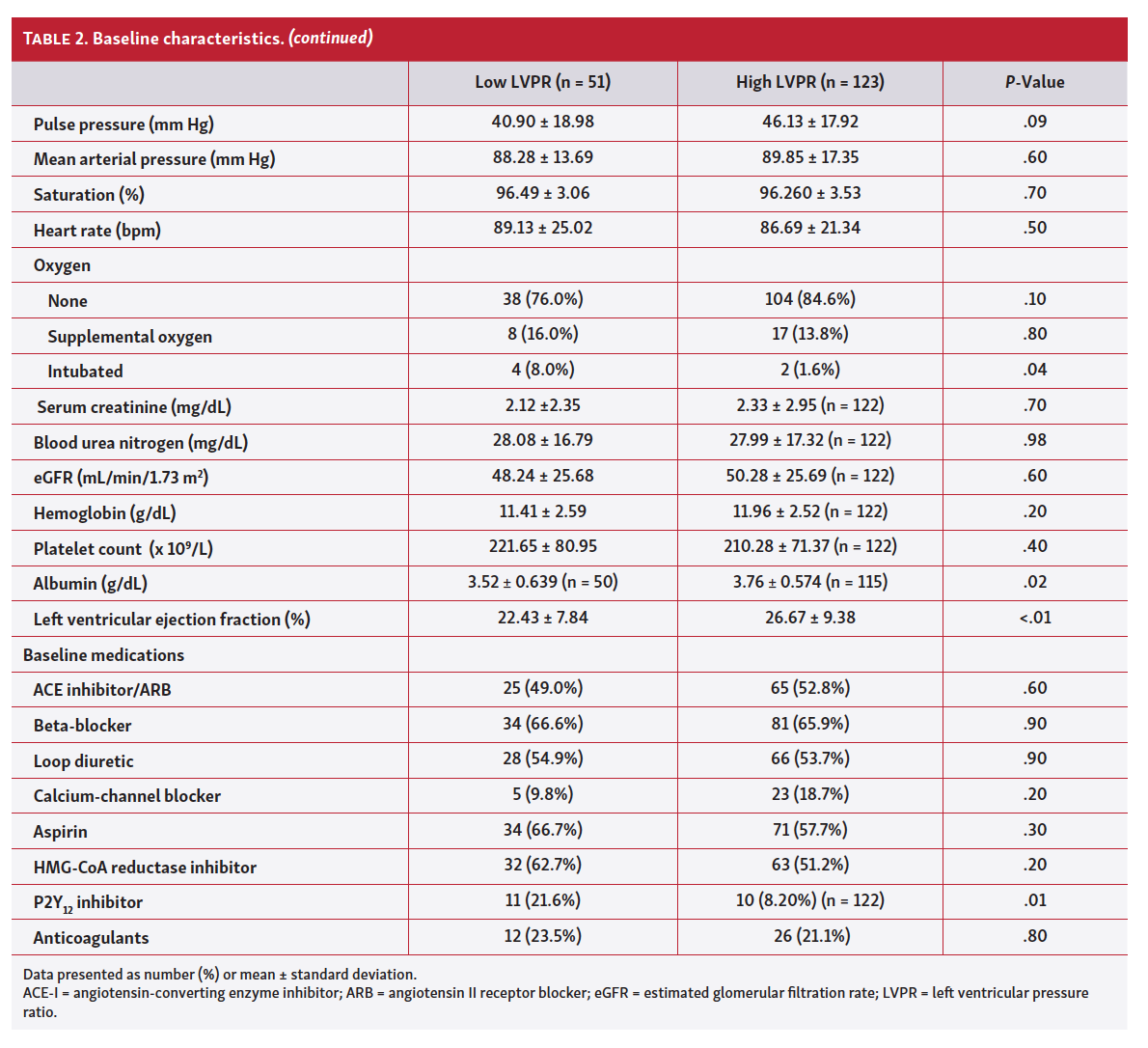 Based on the cut-off of LVPR ≤3.96, a total of 51 patients had low LVPR and 123 patients had high LVPR. There were few significant differences in baseline demographics, clinical characteristics, or medication use between the 2 groups. Patients with low LVPR had higher body mass index and body surface area, higher percentage intubated, lower albumin, and lower LVEF, and were more likely to be on a P2Y12 inhibitor at baseline (Table 2). Indications for LHC were mostly for worsening HF (66.7%), followed by preoperative evaluation (18.4%), stable angina or positive cardiac stress test (9.2%), non-STEMI (2.9%), and STEMI (2.9%), with no significant differences in LHC indication between the 2 groups (Table 3). At the time of LHC, 3.4% of patients were on intra-aortic balloon pump support, 16.1% required inotropes, and 8.0% required vasopressors, which were not significantly different between the 2 groups. LHC revealed predominantly non-obstructive coronary artery disease (CAD; 69.5%), with 6.3% of patients undergoing PCI during the initial catheterization, 4.0% with planned staged PCI, and 4.6% with planned coronary artery bypass graft surgery. Baseline hemodynamics revealed significantly higher LVEDP (31.3 ± 4.5 mm Hg vs 19.6 ± 8.0 mm Hg; P<.001), lower cardiac index (2.28 ± 0.63 L/min/m2 vs 2.57 ± 0.83 L/min/m2; P=.03), and lower pulmonary artery pulsatility index (2.00 ± 1.07 vs 3.67 ± 4.90; P=.02) in the low LVPR group compared with the high LVPR group, respectively. There were no significant differences in cardiac output, pulse pressure, shock index, or cardiac power output between the 2 groups.